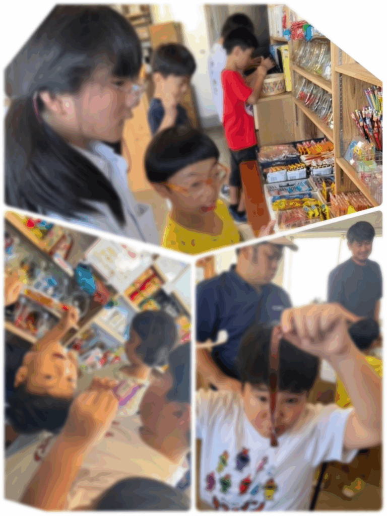 店内には駄菓子も並んでおり、子どもたちは楽しそうにおやつを選びながら、