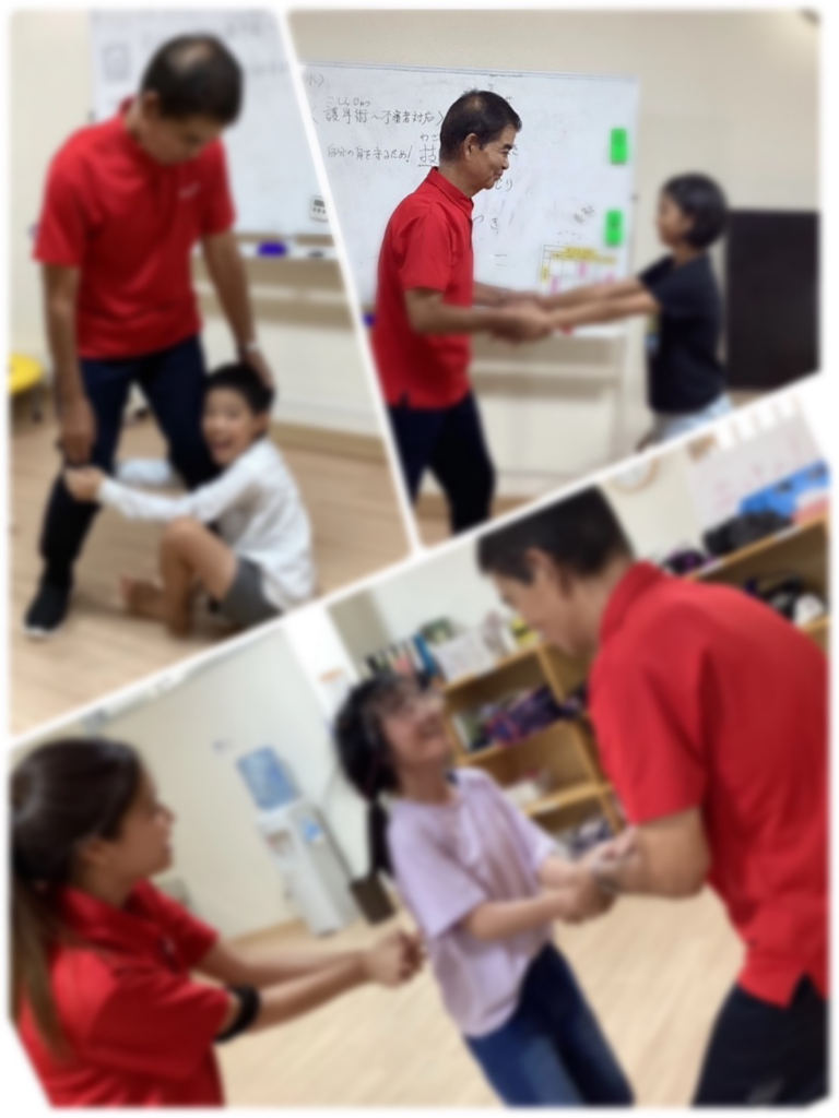 「肘寄せ」「両手抜き」「合掌どり」「だきつき」など、不審者に手をつかまれたときに使える技を職員が分かりやすくレクチャー👊✨